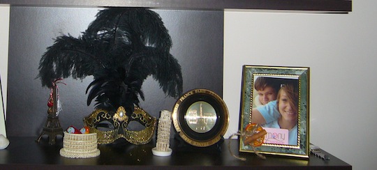 Dacă îți ridici ochii de la ghiduri dai nas în nas cu poza noastră preferată. Nu râde! E făcută în trenul ce ne ducea spre Deltă în 2007. Suntem așa de mici în toate sensurile în poza asta, dar atât de fericiți de libertatea pe care ne doream să o gustăm, încât de câte ori văd poza parcă ies din mine și simt vântul ce ne bătea prin păr în goana acelui tren infect luat din Medgidia. Ca și cum le-aș fi aliniat cronologic (deși abia acum îmi dau seama că așa sunt puse), stau lângă fotografie: masca din Piazza San Marco (Veneția 2009), Turnul Eiffel (Paris 2009), MiniColosseo (Roma 2010), o replică a Turnului din Pisa (Toscana 2011)… Cât am crescut în amintiri de la acea poză făcută în personalul de Tulcea?