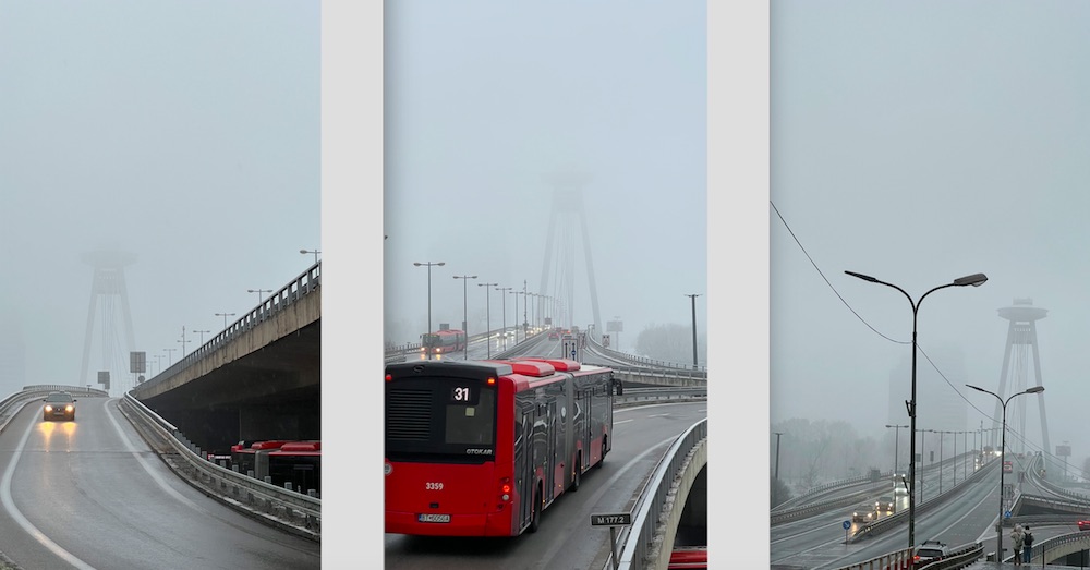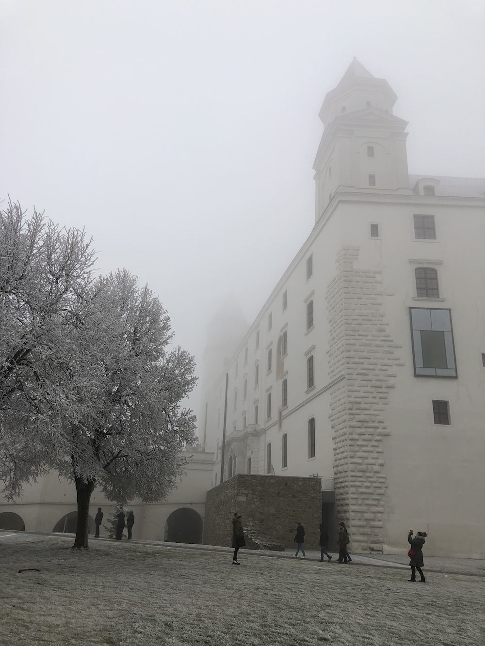 Ultima zi din an, aceea de îmi place mie maxim de obicei, a început pe o ceață mai densă ca și ciocolata caldă băută cu o seară înainte, însă foarte potrivită momentului. Sigur, nouă ne-a dat puțin planurile zilei peste cap, dar frumusețea e că ne-am adaptat, orașul nu duce lipsă de oportunități de petrecere a timpului de calitate, dar nici nu abundă în locuri ce musai trebuie bifate, așa că… Am profitat de zona în care ne-am cazat, o clădire cu apartamente închiriate în regim hotelier (detalii, dacă doriți), care avea la parter tot ce îți puteai dori ca să funcționezi bine (cafeneaua Triplefive, băcănie, farmacie, patiserie și mini-market), ne-am făcut câteva cumpărături pentru masa de Revelion, le-am lăsat în apartament și apoi am plecat spre centru pentru un tur al magazinelor de jucării (Dracik & Bratislava Comicbookstore, foarte bune amândouă, ambii băieți s-au ales cu câte ceva). Planul de după era să mergem la Castelul Bratislava, trecând pe la Catedrala Sfântul Martin, și apoi să ajungem la Podul UFO, simbol al orașului, unde pe lângă panorama ce poate fi admirată de la punctul de observare, puteam lua și prânzul la restaurantul din vârf. În urmă cu 10 ani n-am fost (nu mi-e clar de ce), așa că ne-am dorit să o facem acum, daaar CEAȚĂ, așa ceață de nici Castelul (prima foto jos) nu-l puteai zări prea bine, de Turnul Podului (primul colaj, mai jos) nici nu putea fi vorba. Dar cine suntem noi să ne punem cu vremea, mai ales iarna și cum altfel ne-am arăta maturizarea mai bine decât acceptând ceea ce nu putea fi schimbat. Însă ce bine că există ele, cafenelele – și cum ne-am mai mutat noi din una în alta printre cele câteva obiective văzute, ad litteram, ca prin ceață.