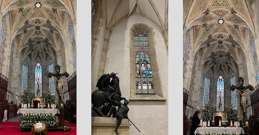 Când am văzut că vremea nu se dă schimbată, deși parcă pentru o jumătate de oră ai fi zis că avem noroc, ne-am dus să revizităm Catedrala Sfântul Martin, unde știam că deja se montau camerele și luminile pentru transmiterea Slujbei de Anul Nou la Televiziunea Națională, dar asta nu ne-a deranjat, am putut să admirăm frumoasa construcție chiar și așa, la fel ca în urmă cu 10 ani. Îmi place mult că, spre deosebire de Catedrala Sfântul Ștefan din Viena unde nu te poți plimba în voie să o admiri (acel grilaj făcând imposibil accestul turistilor sub cupolă), aici intrarea este liberă și chiar te poți bucura de bogăția din interior. Ca idee, ma deranjează locurile unde accesul în Biserici și Catedrale este atât de restricționat, din fericire în marea lor majoritate se poate intra (chiar și la Vatican) ceea ce denotă un respect pentru oameni și nu se pleacă de la prezumția că ar putea deranja sau strica cineva, ceva în interior.