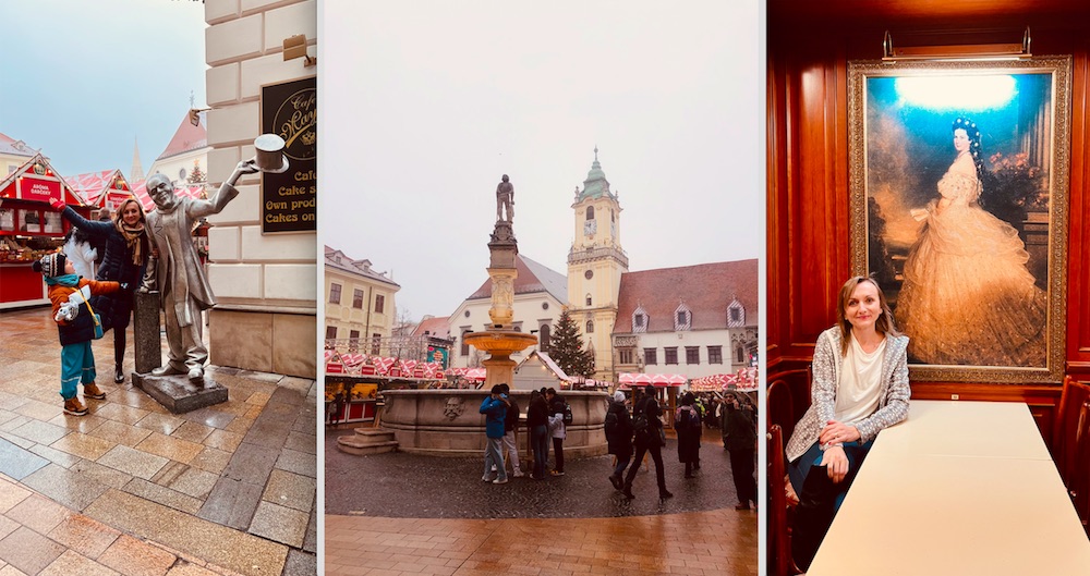 Înainte de a ne da seama exact cum facem cu ziua pe mai departe, am intrat la o altă cafenea istorică din oras, Cafe Mayer, (prima foto jos), celebră pentru ciocolata artizanală, Chestnut nest-ul în stil, cum altfel, decât vienez și ciocolata caldă semisolidă absolut delicioasă, fără adaos de lapte (lucky me). Aici se poate și lua masa principală, nu doar desertul, însă noi luasem un mic dejun în cameră, două merdenele pe drum și parcă numai dulcele ar mai fi încăput. Din desing-ul interior puteai jura că ești în Viena, localul arată FIX ca cele din capitala Austriei, dar asta nu supără pe nimeni, este moștenirea lor și nimeni nu le-o poate lua. De neratat, în fața cafenelei este una din celebrele statui amuzante ale capitalei, Schöner Náci, care se spune că a fost o persoană reală, un personaj de oraș de pe vremuri, care saluta pe toată lumea și era cunoscut de toți locuitorii orașului. Sfat: Căutați toate aceste statui de prin centrul Bratislavei, fiecare are o poveste interesantă și se află în puncte turistic strategice, noi am văzut mai multe la vizita precedentă.